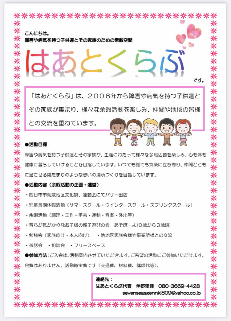 【障がいや病気をもつ子ども達とその家族のための素敵空間 はあとくらぶ】